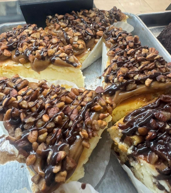 A luscious cheesecake drizzled with caramel and chocolate and finished with pecans.