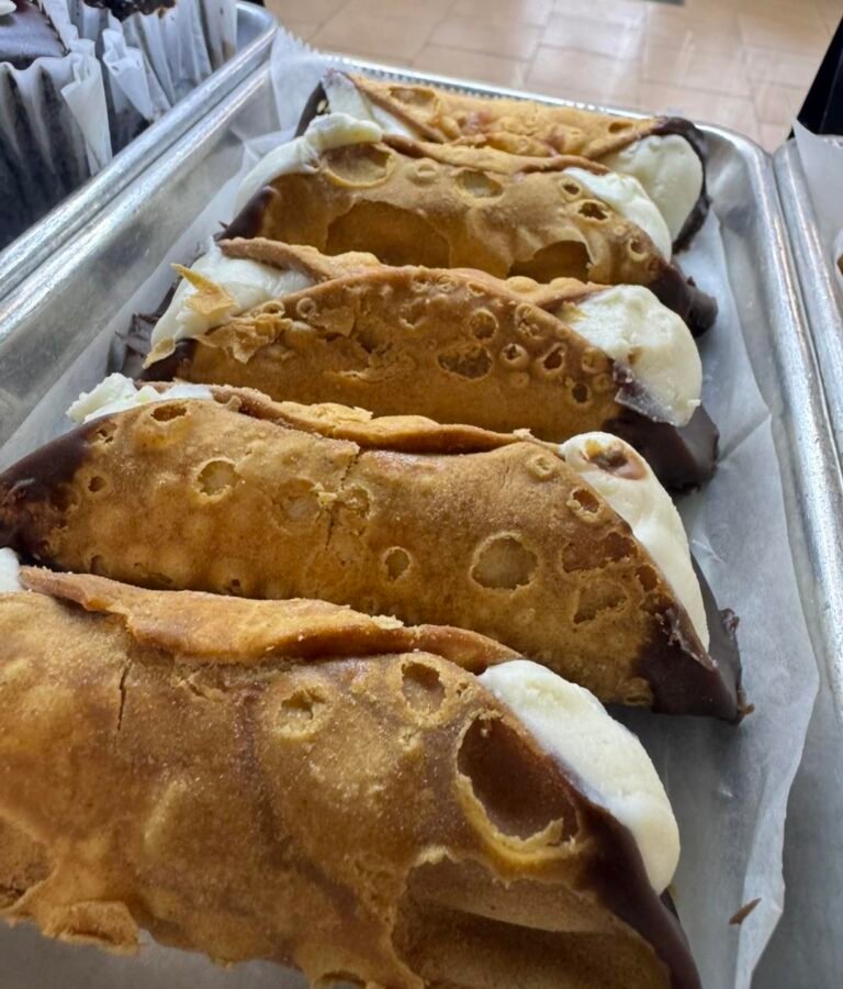 Crispy pastry shells filled with sweet ricotta cream, sometimes with chocolate chips or pistachios.