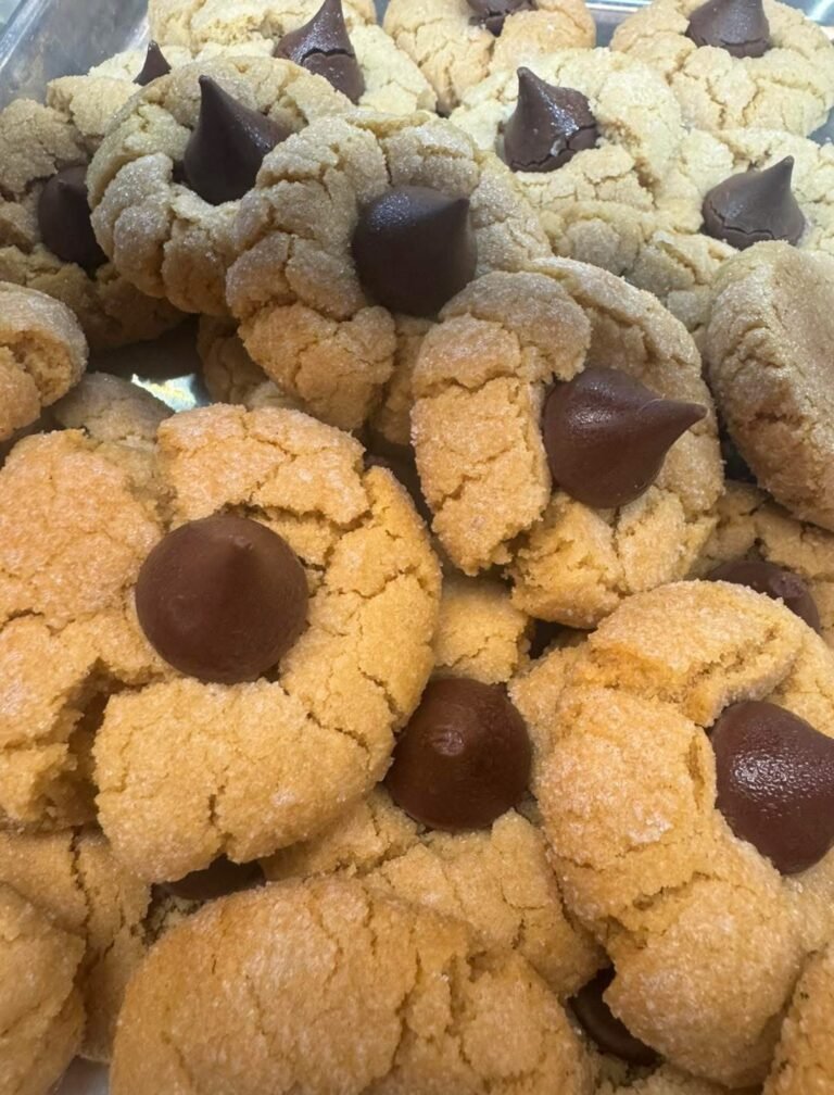 Classic peanut butter cookies topped with a Hershey’s Kiss at the center.
