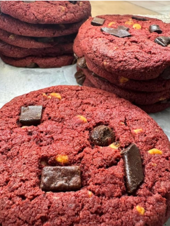 Red velvet cookie with a soft center and subtle cocoa flavor, often topped with white chocolate chips.
